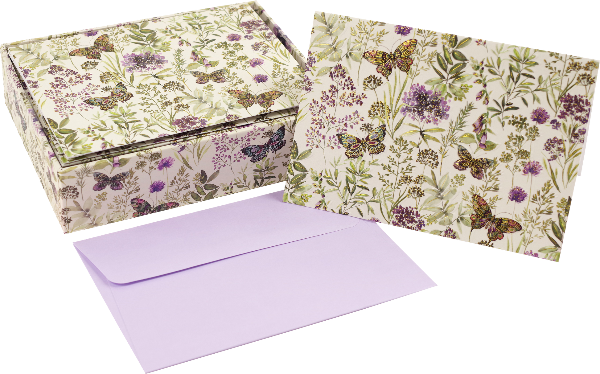 Four butterflies take flight above a meadow of wildflowers on these elegant note cards. Premium boxed stationery set comes with 14 note cards and 15 envelopes.