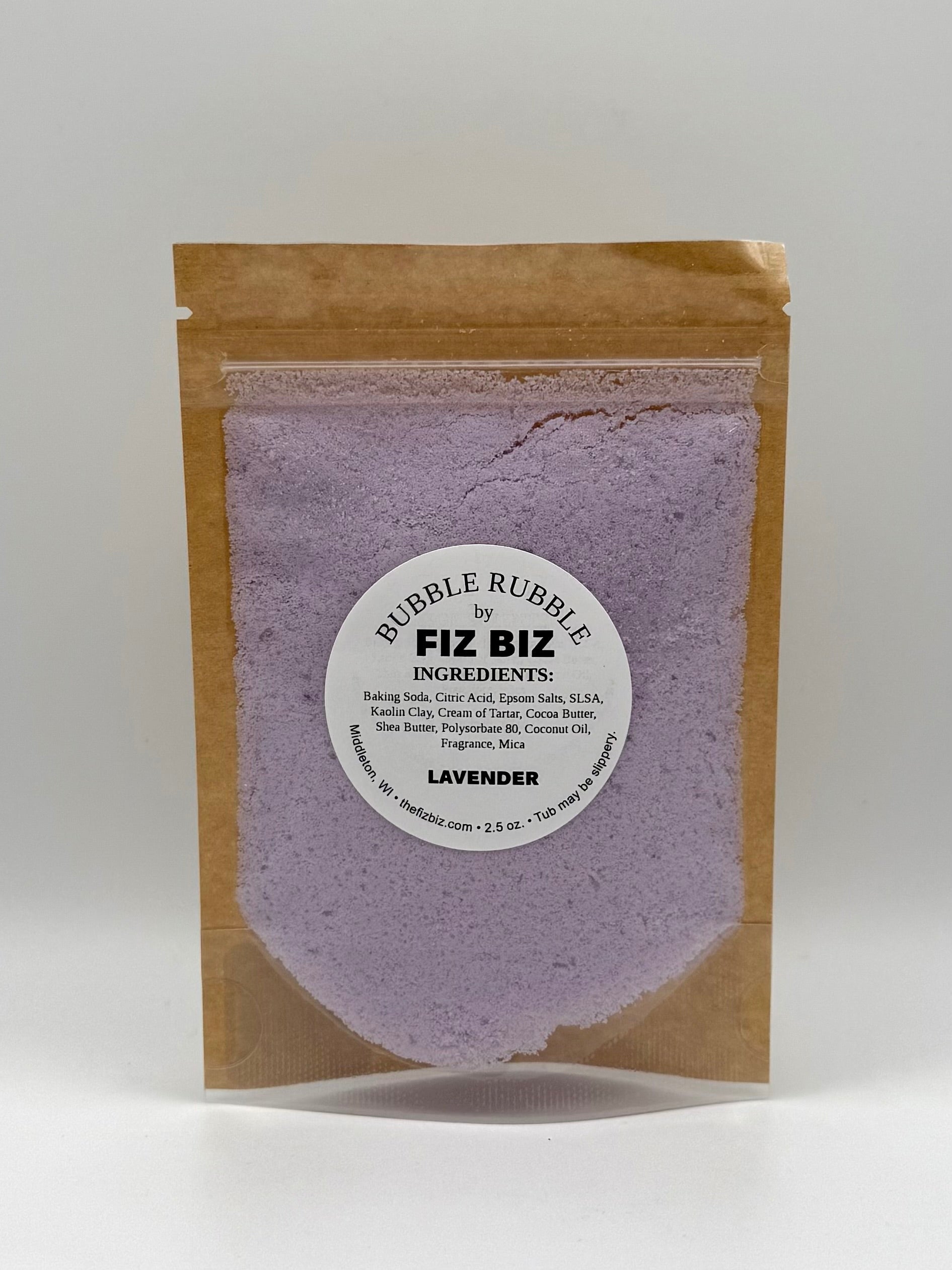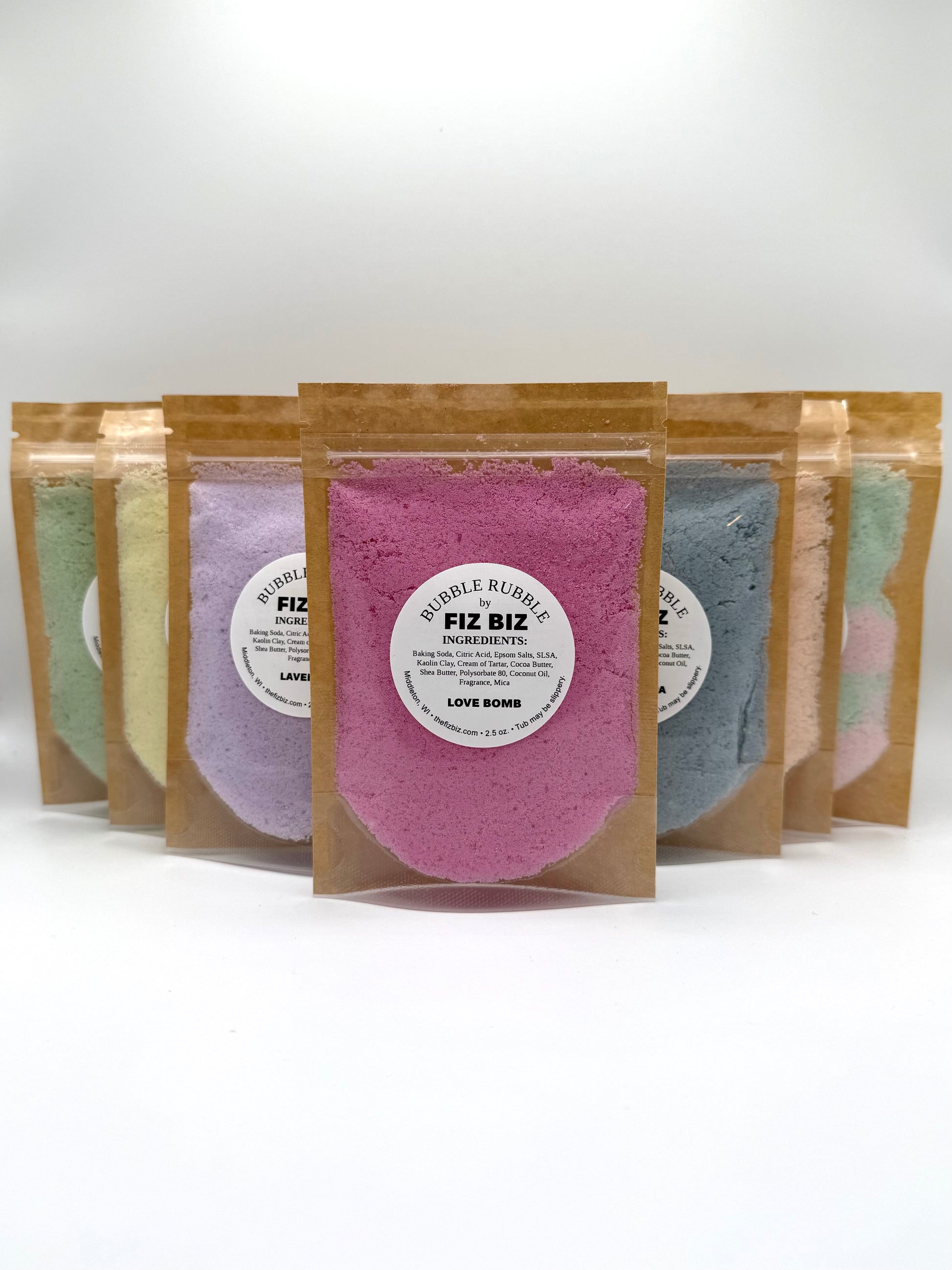 Ingredients: Baking Soda, Citric Acid, Epsom Salts, SLSA, Kaolin Clay, Cream of Tartar, Cocoa Butter, Shea Butter, Polysorbate 80, Coconut Oil, Fragrance, Mica