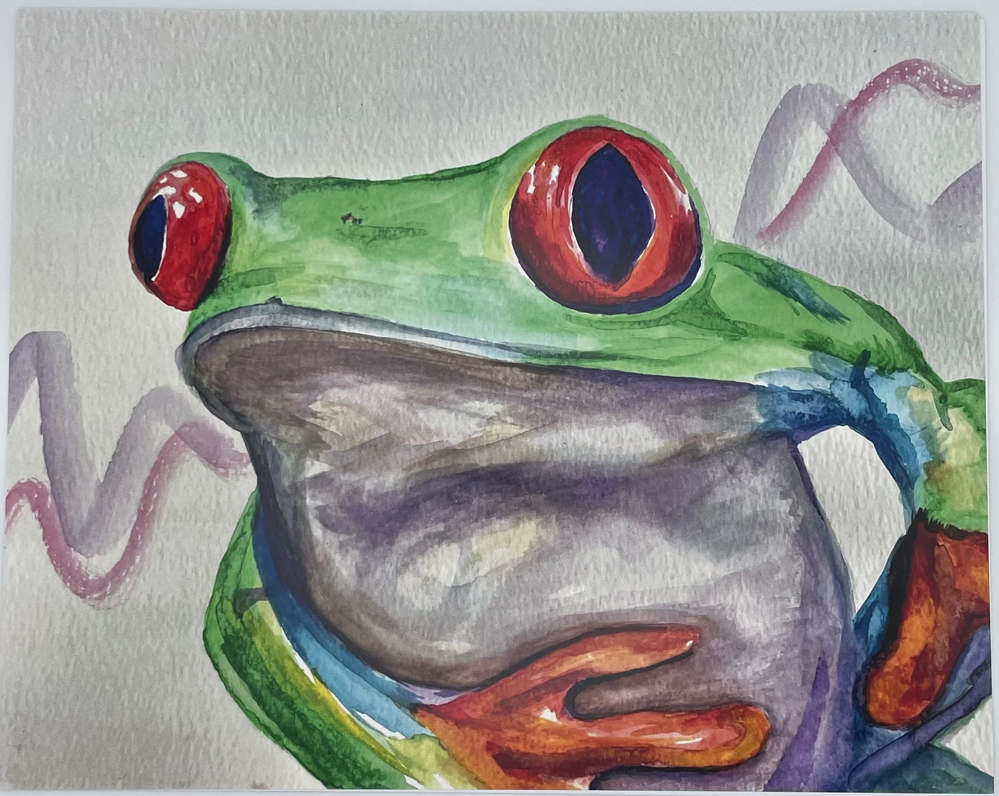 Print depicts a close up of a curious frog.