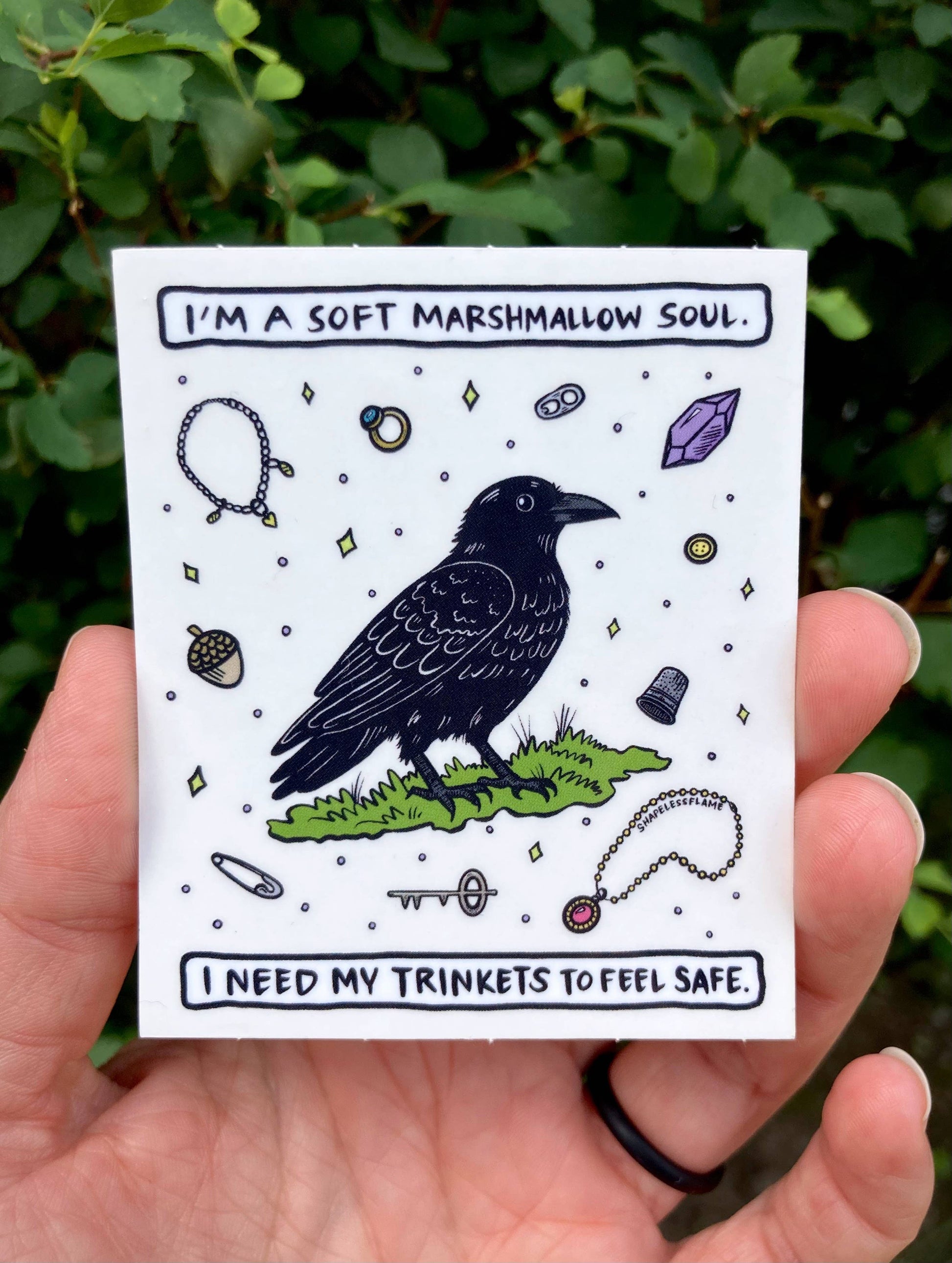 Vinyl Sticker - Crow stating, "I'm a soft marshmallow soul. I need my trinkets to feel safe."