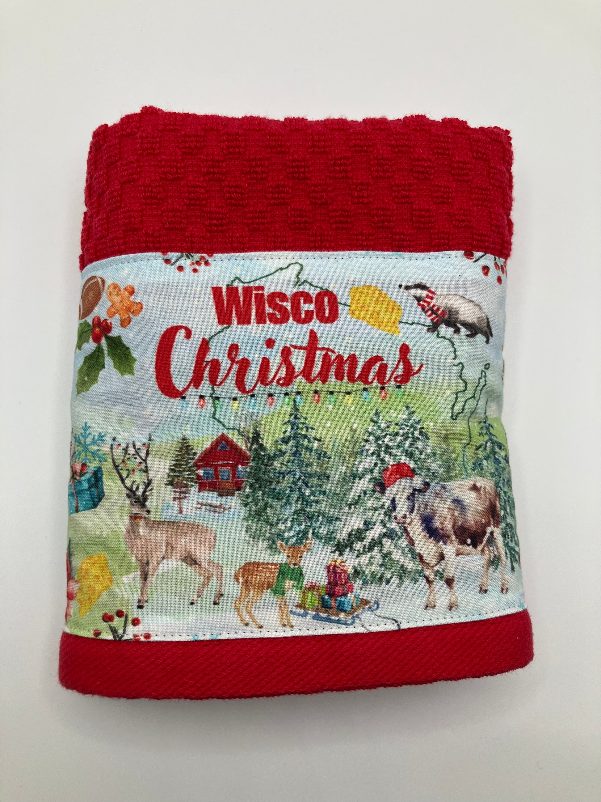Christmas themed with a little Wisconsin twist on a bright red towel.