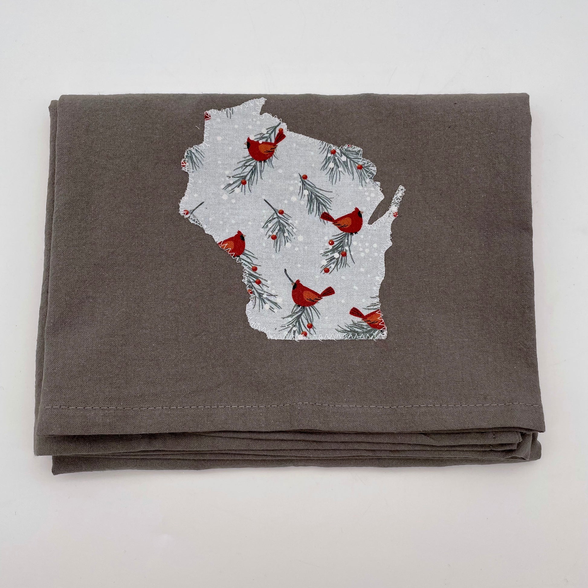 Silhouette of WI filled in with a winter pattern of cardinals and evergreens.