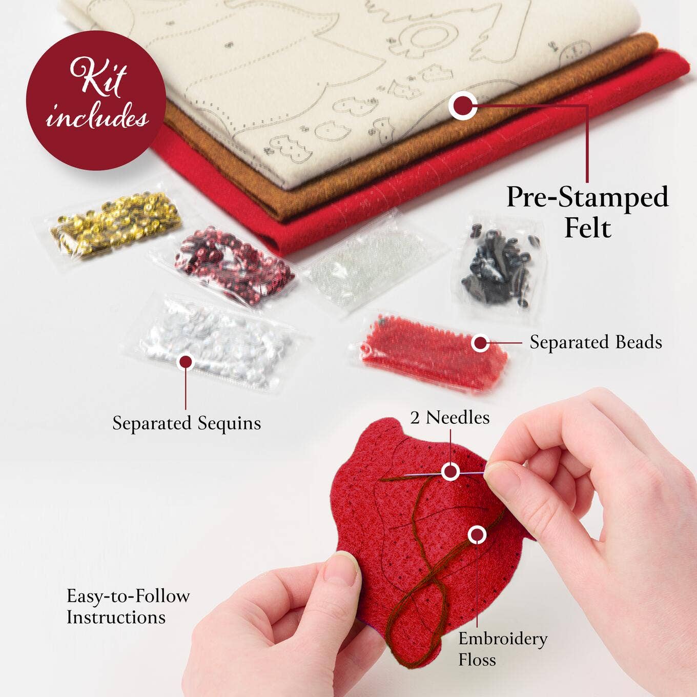 This embroidery kit includes the basic materials needed to create ornaments including pre-stamped felt, cotton embroidery floss, separated sequins and beads, 2 embroidery needles, and easy to follow instructions.