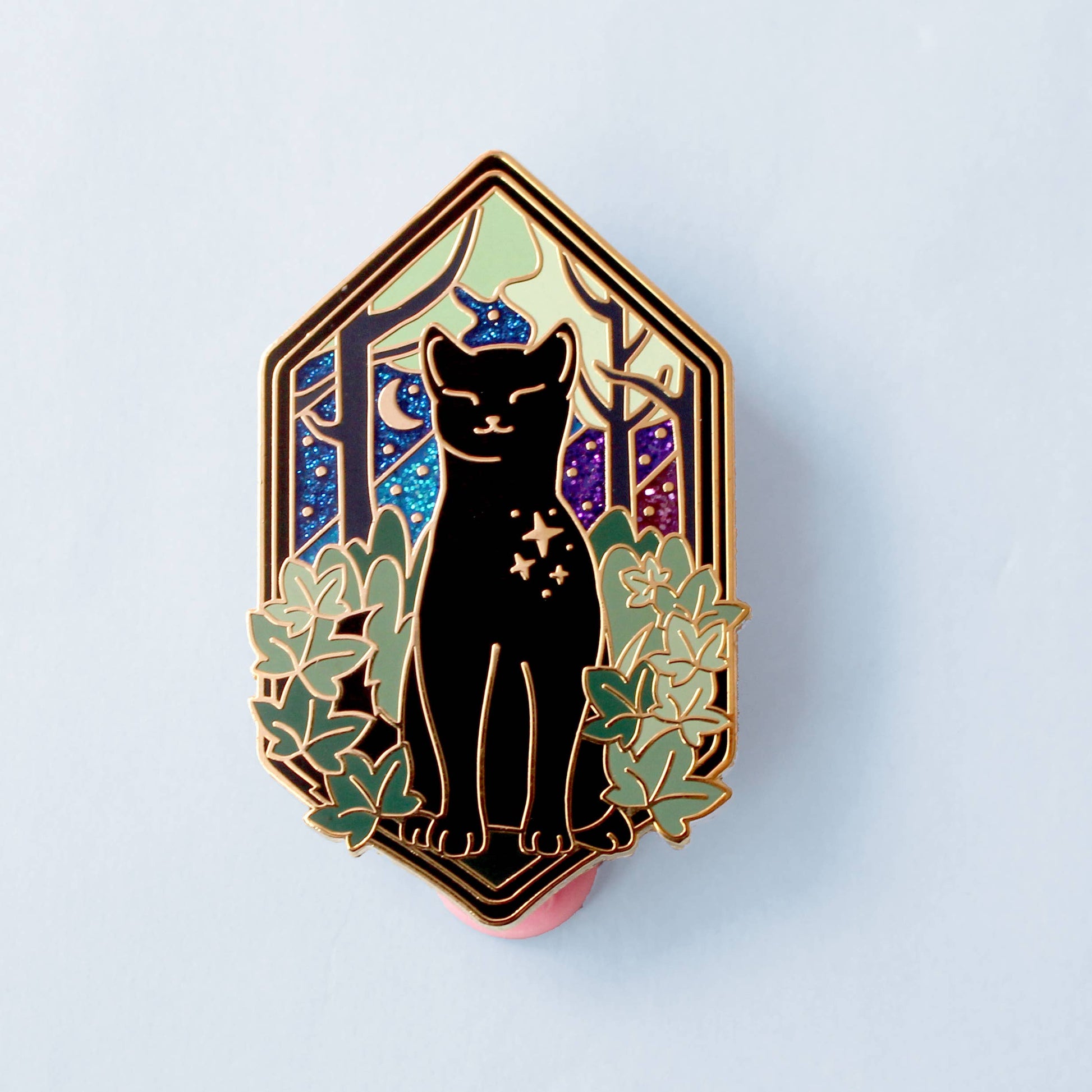 This fabulous Forest Cat is looking up at a glittery sky, surrounded by trees and framed by trailing ivy plants. The pin is secured by two green heart backs and comes on a special ‘Art Nouveau’ Glitter Punk backing card, making it perfect for a gift or to keep as a special treat for yourself.