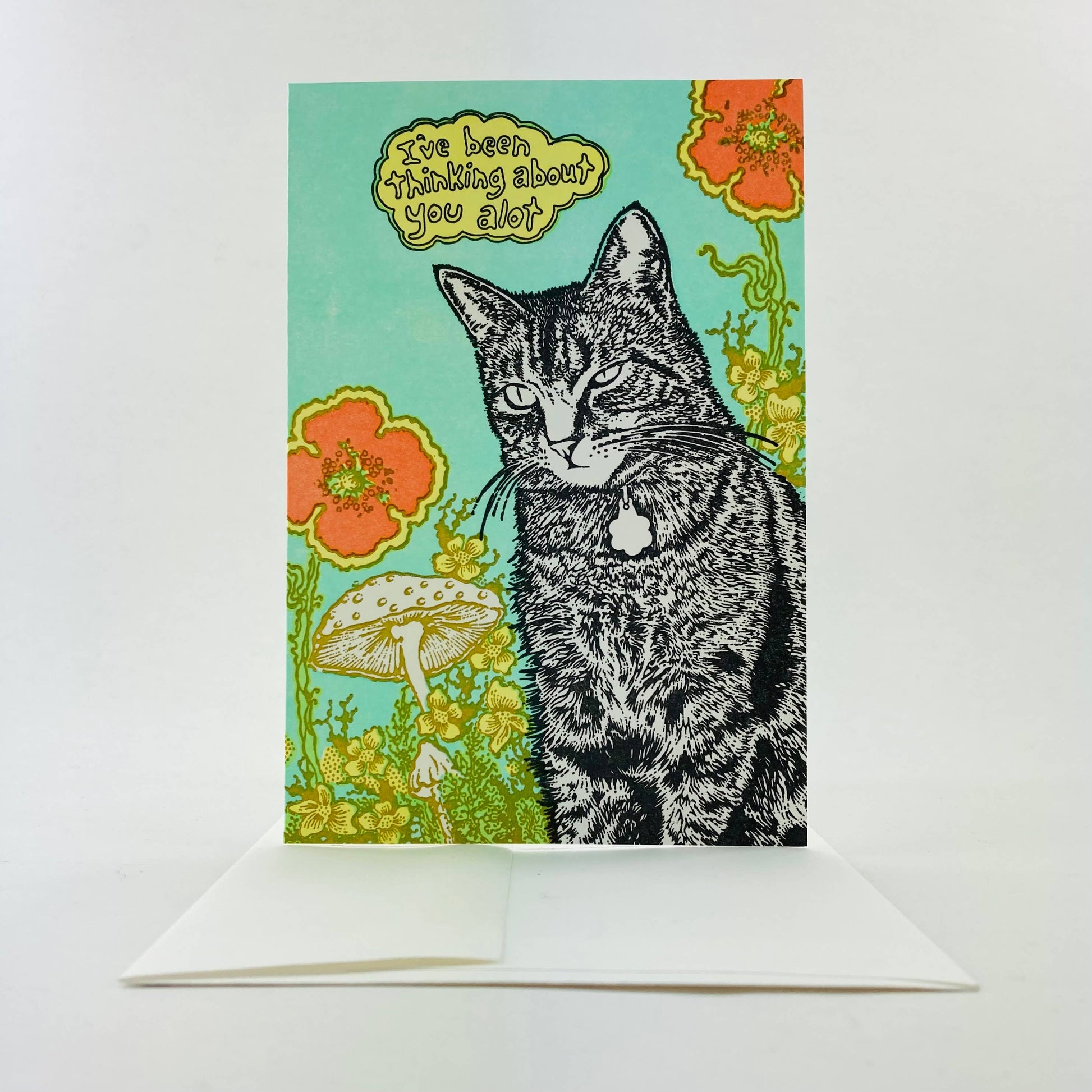 Cat deep in thought. Faithful friend and ally thinking of you. Flowers and mushrooms and your best cuddle buddy. Letterpressed in multiple overlapping colors.