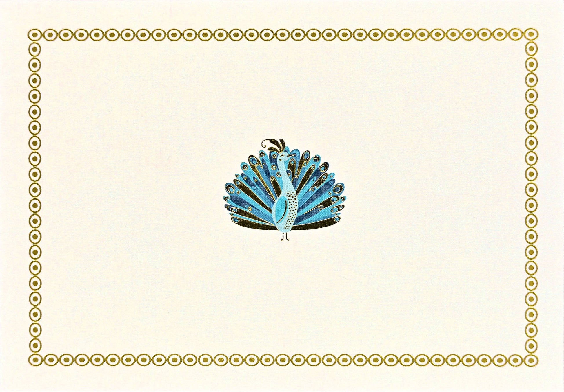 A jewel-like peacock design, set off with a decorative gold foil border, is the focus of these elegant note cards.