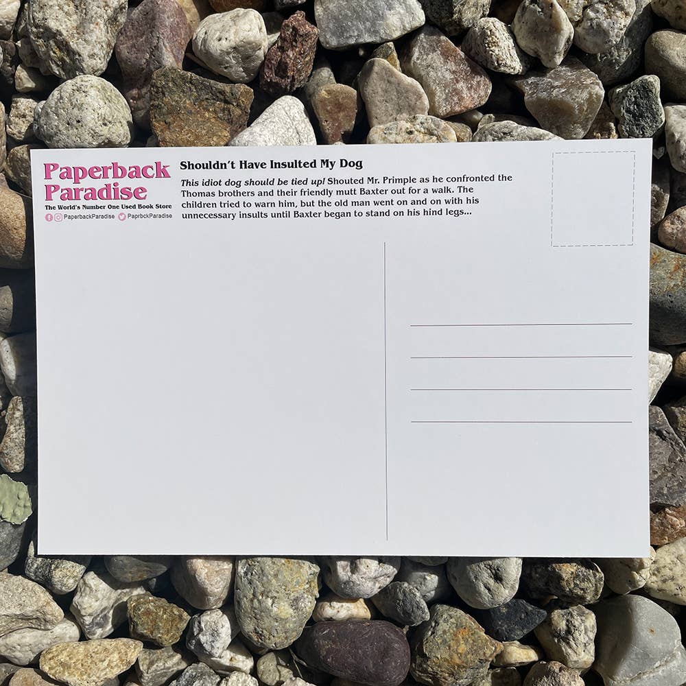 Back synopsis: This idiot dog should be tied up! Shouted Mr. Primple as he confronted the Thomas brothers and their friendly mutt Baxter out for a walk. The children tried to warn him, but the old man went on and on with his unnecessary insults until Baxter began to stand on his hind legs...