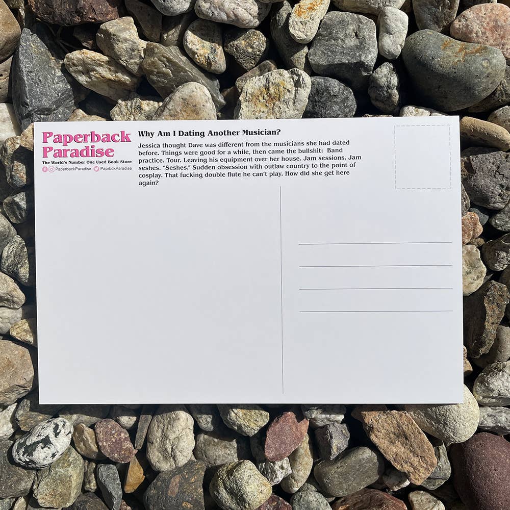 Back synopsis: Jessica thought Dave was different from the musicians she had dated before. Things were good for awhile, then came the bullshit: Band practice. Tour. Leaving his equipment over her house. Jam sessions. Jam seshes. "Seshes". Sudden obsession with outlaw country to the point of cosplay. That fucking double flute he can't play. How did she get here again?